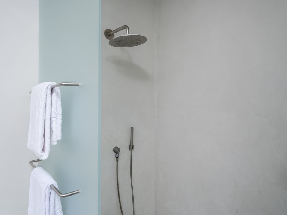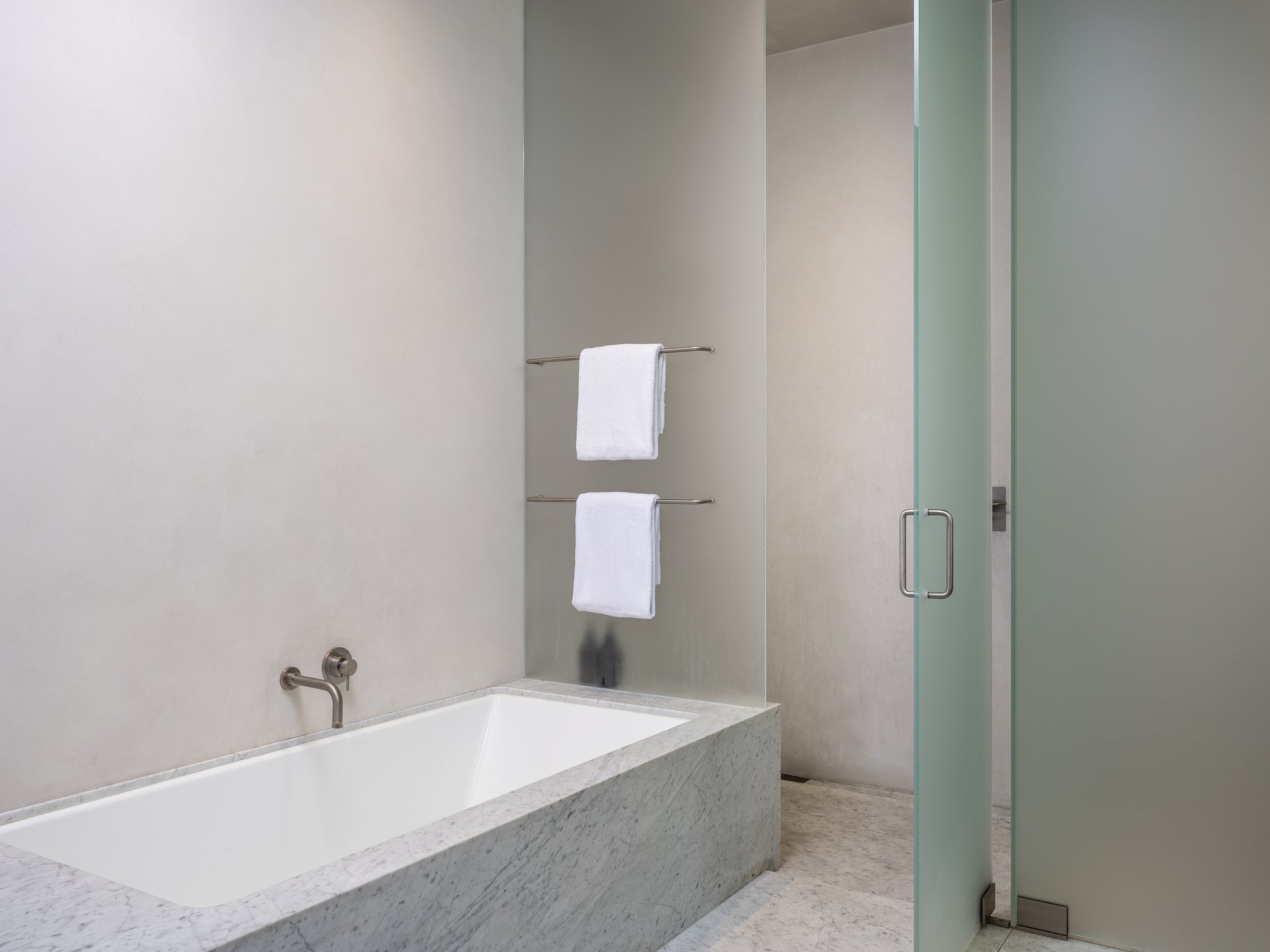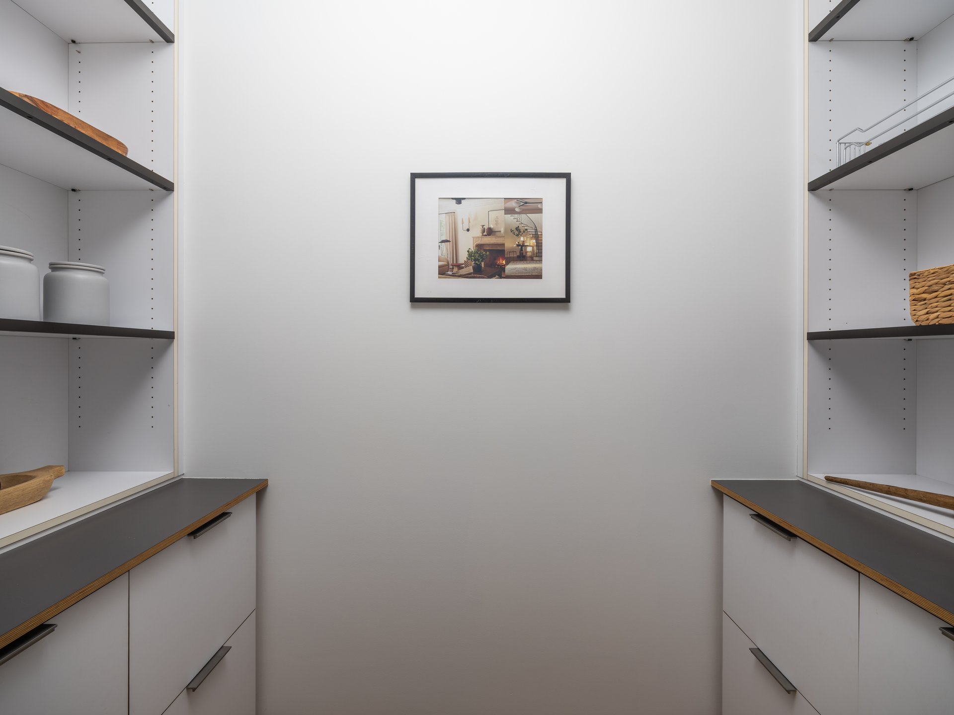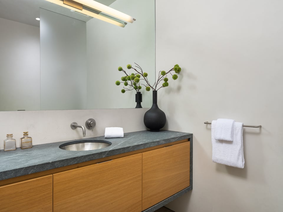 The expansive main living area is an open floor plan, with the living and dining areas flowing effortlessly together with the chef’s kitchen which includes quartzite and stainless-steel countertops, a large island, Henrybuilt cabinets, a spacious pantry, and Gaggenau appliances. The primary bedroom features two walls of windows, a generous walk-in closet, a spa-like bathroom with a soaking tub, a large shower, a handsome Henrybuilt cabinet with a marble countertop, and smooth, waterproof plaster-finished walls. Another large bedroom wing includes plentiful closet space, a full bath with limestone floors, a Henrybuilt cabinet with a Pietra Cardosa countertop, and plaster walls. A well-appointed laundry room with stainless-steel counters rounds out the home.
