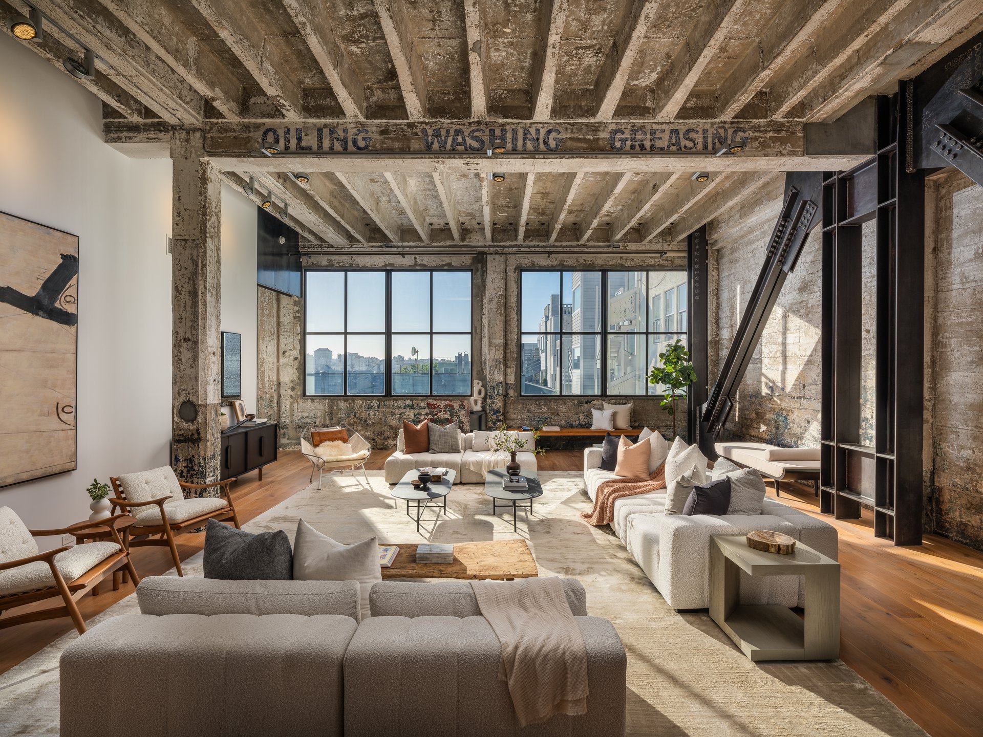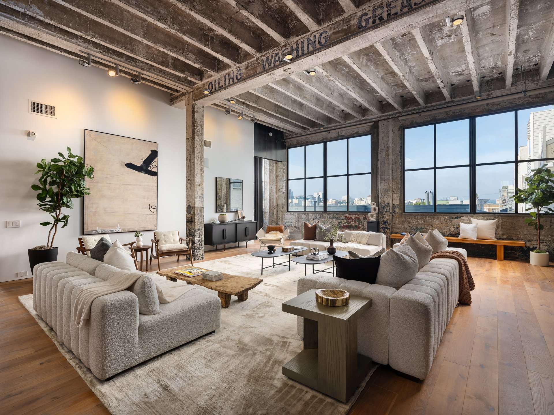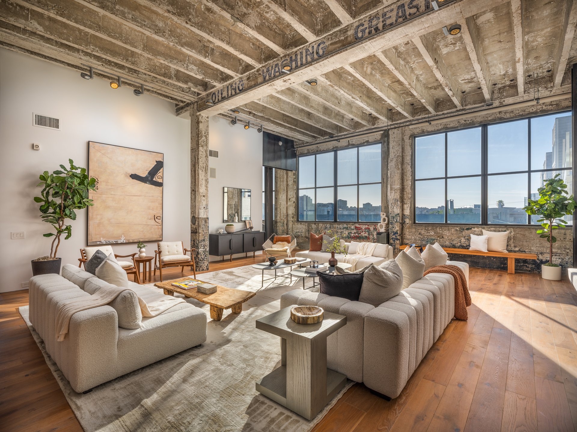 Inside, exposed concrete walls and soaring 14' ceilings along with walls of enormous south and west-facing windows create a dramatic backdrop for chic, light-filled living. Massive steel trusses and beams, original, stenciled wall graphics, and wide-plank white oak floors add to the property’s wow factor.