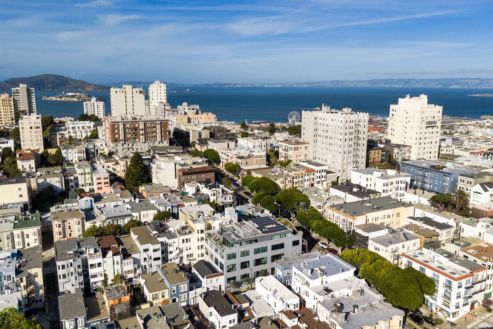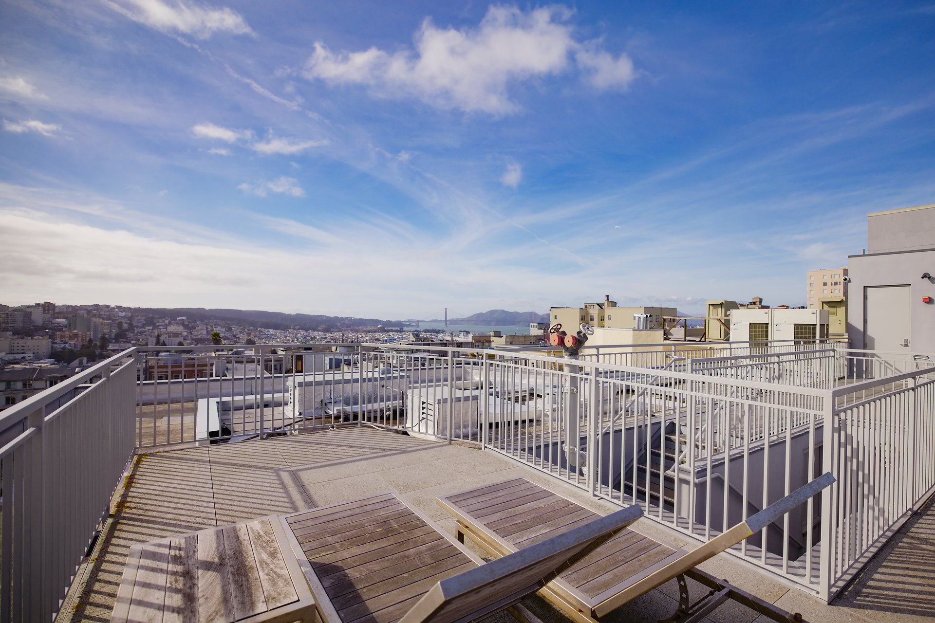 The building includes 7 residential units and 1 commercial space. Building amenities include a central boiler system providing radiant heat for each unit, a panoramic rooftop deck with Golden Gate Bridge and city views, private storage, a spacious commercial elevator, solar electric for each residence, and double-glazed steel and triple-glazed aluminum windows, ensuring a quiet and light-filled interior throughout the day. Unit 3 has A/C and includes parking for two cars.