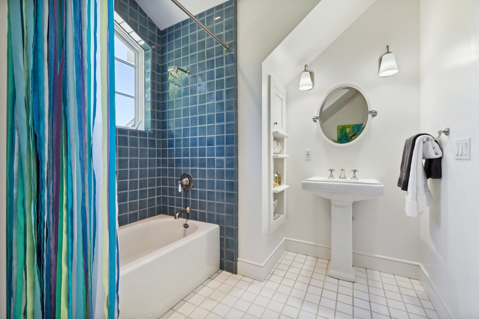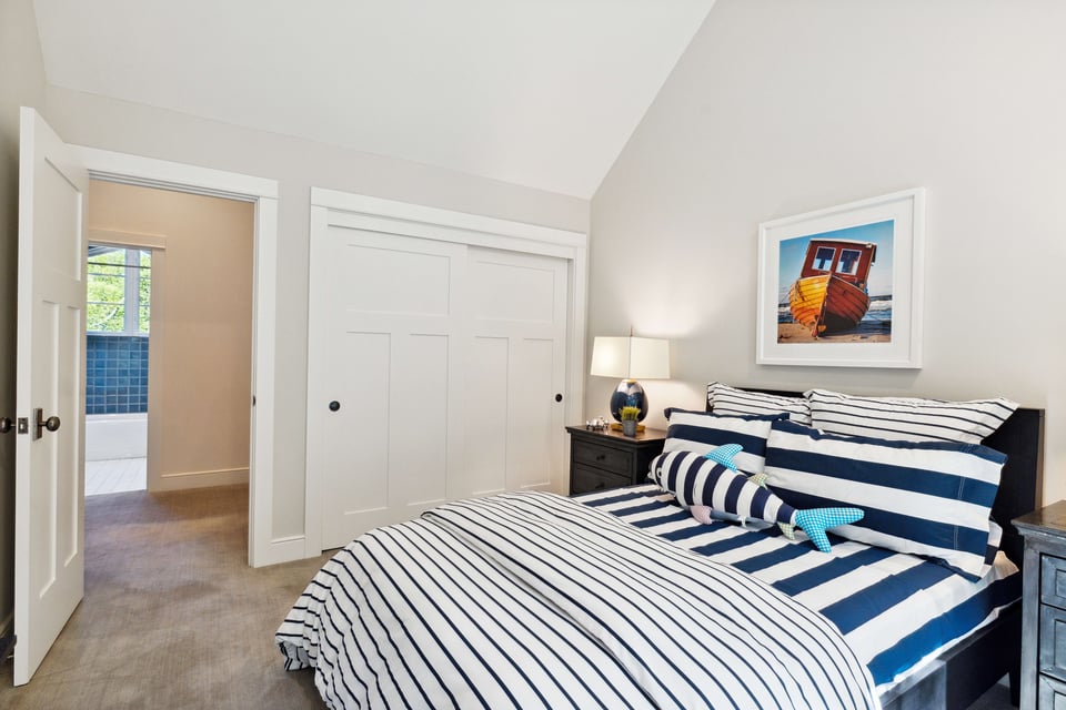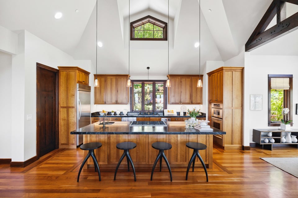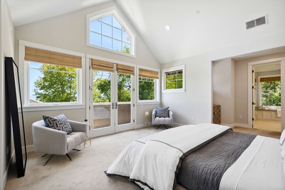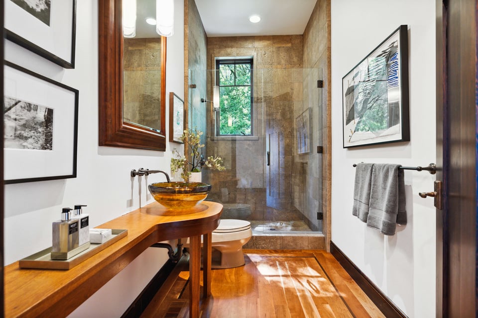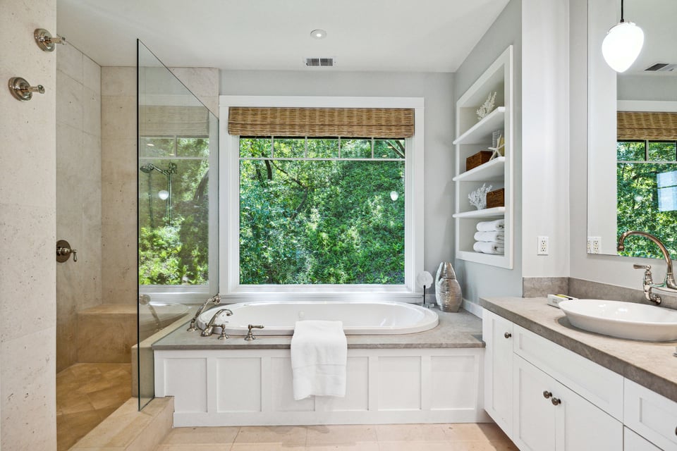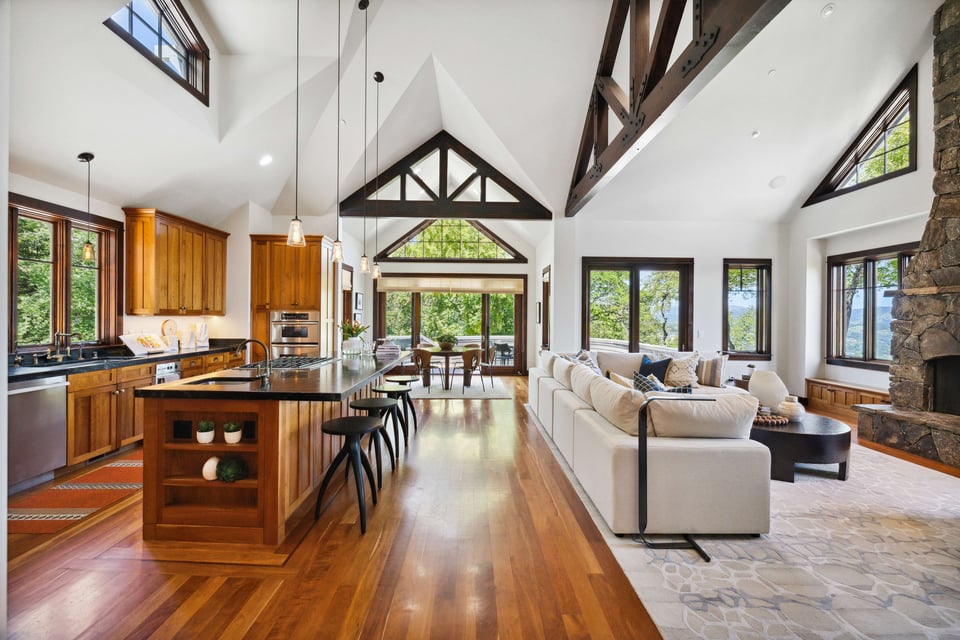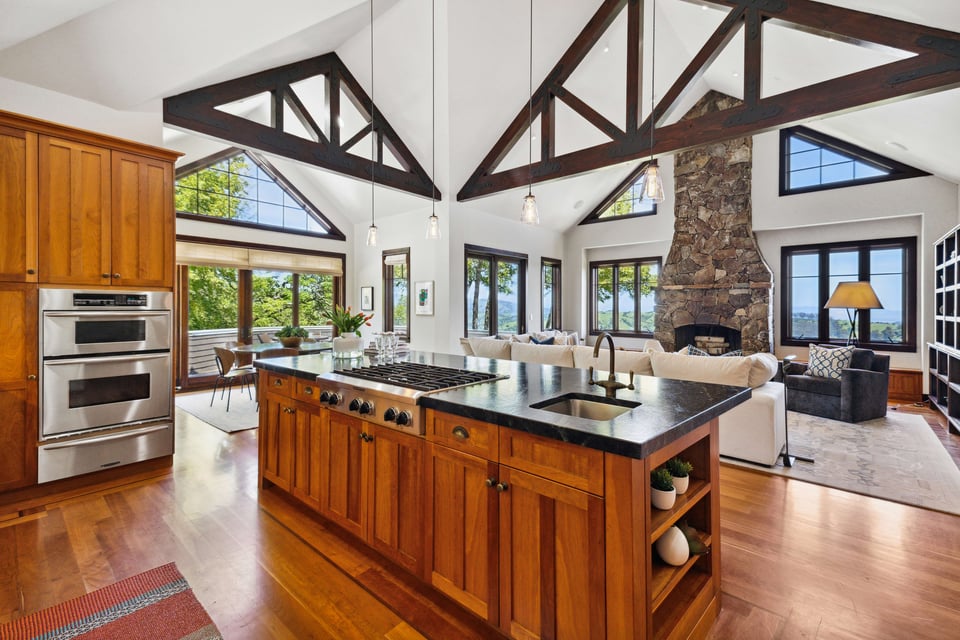 Upstairs, the primary suite features vaulted ceilings, an enormous walk-in closet, and a spa-like bath with a large jetted soaking tub. The adjacent, private balcony is a great spot to start the day with a steaming cup of coffee taking in the ever-changing, panoramic view. Two additional bedrooms and a full bathroom are down the hall, followed by a fourth en-suite bedroom with access to a lovely patio beneath the majestic trees.