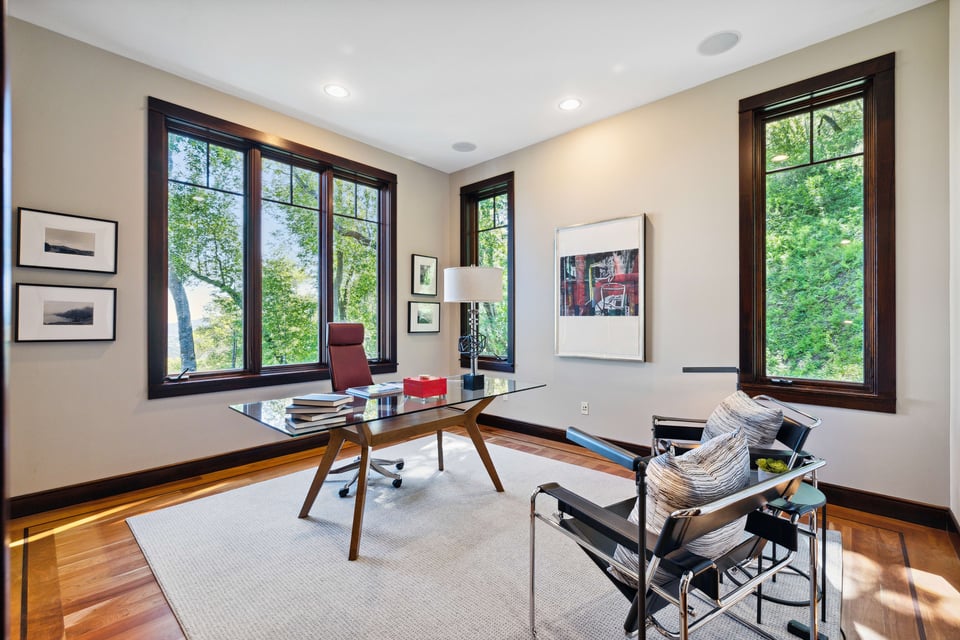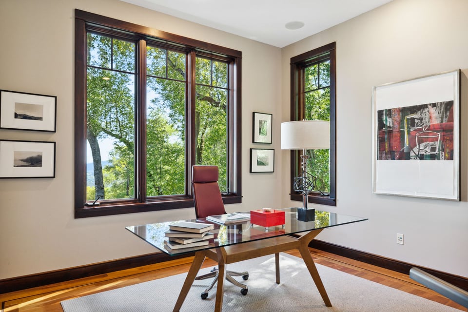 The home has terrific scale with soaring, vaulted ceilings, dramatic trusses, hardwood floors, and custom architectural details throughout. The chef’s kitchen, with soapstone countertops, a large island, a spacious pantry, and stainless-steel appliances, is adjacent to a sizeable great room, punctuated with a stunning stone fireplace. Just off these areas is an inviting deck, perfect for outdoor dining. The dining room has a wall of windows, featuring the impressive view. A gorgeous living room with a fireplace and large windows is an inviting spot in which to entertain. Tucked away is a handsome office, providing a quiet and comfortable place conducive to productivity and creativity, undoubtedly making getting to work a pleasure! A full bath right next to the office enables this area to also be used as a wonderful, private guest suite.